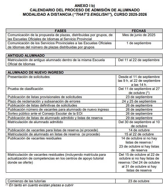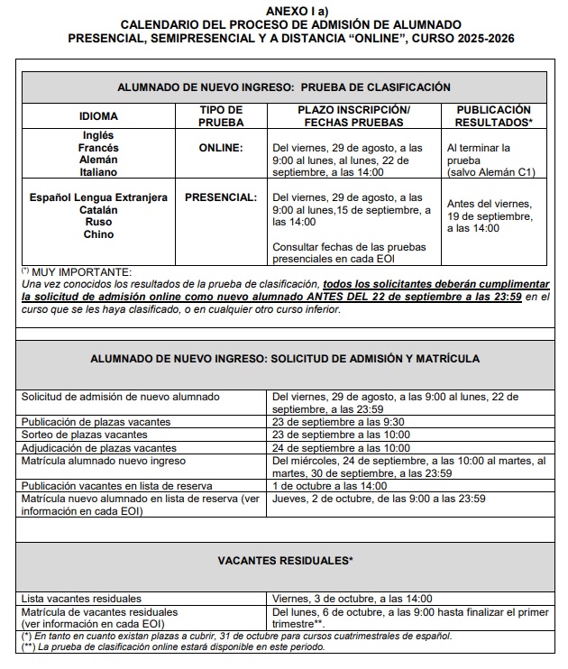 Información extraída de la ORDEN DE LA CONSEJERA DE EDUCACIÓN, CULTURA Y DEPORTE, POR LA QUE SE CONVOCA EL PROCESO DE ADMISIÓN DE ALUMNADO OFICIAL EN RÉGIMEN PRESENCIAL, SEMIPRESENCIAL Y A DISTANCIA “ONLINE”, ASÍ COMO EN EL PROGRAMA “THAT’S ENGLISH!” EN LAS ESCUELAS OFICIALES DE IDIOMAS DE LA COMUNIDAD AUTÓNOMA DE ARAGÓN PARA EL CURSO 2025-2026.